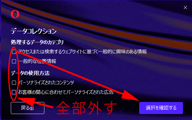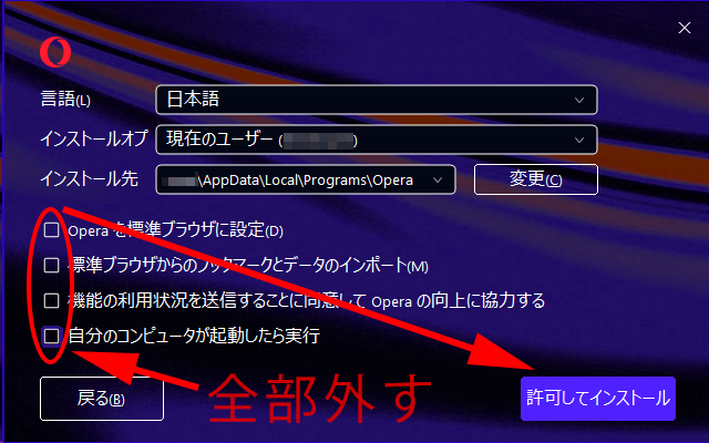 余計なオプションを外してOperaをインストールしていきます。