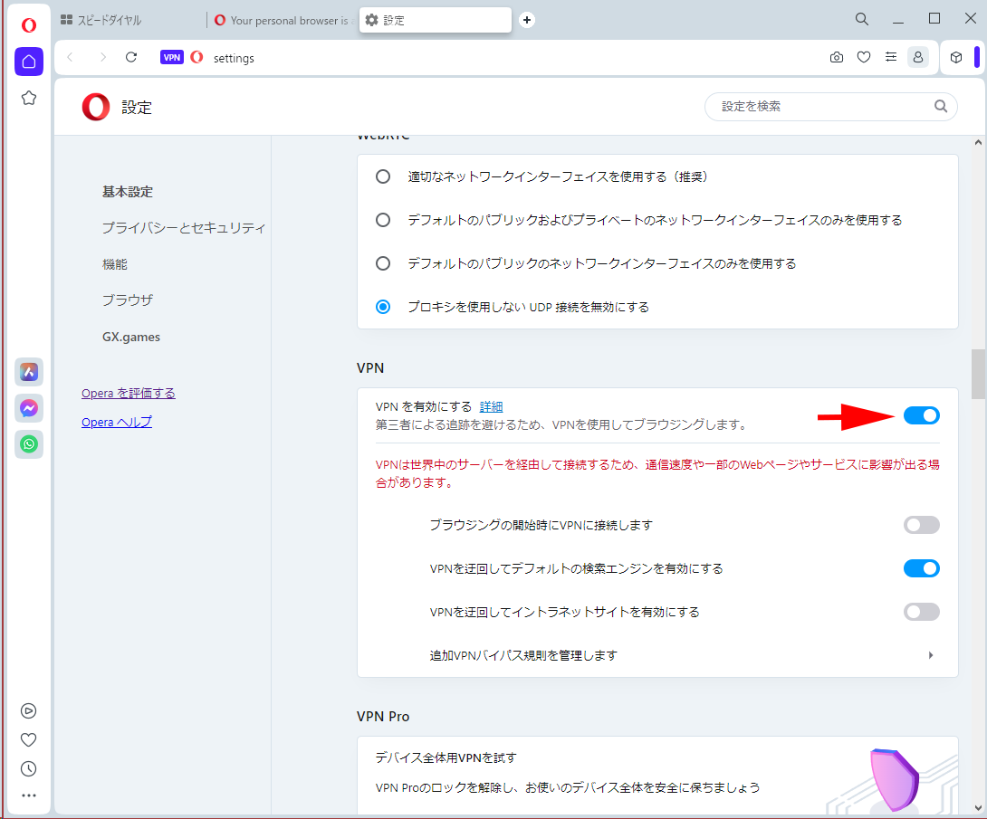 適宜Operaをセットアップして、VPNを有効化させます。